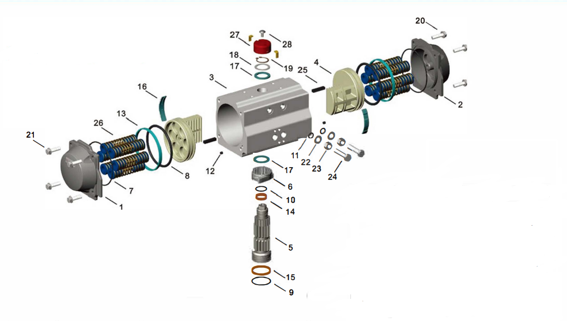 所有的双作用和单作用执行器型号,都具有相同的缸体个端盖,很方便通过加装弹簧或拆除弹簧来改变作用方式。
